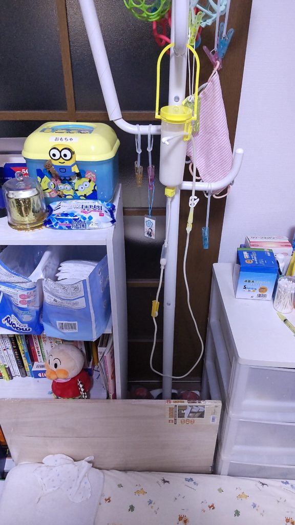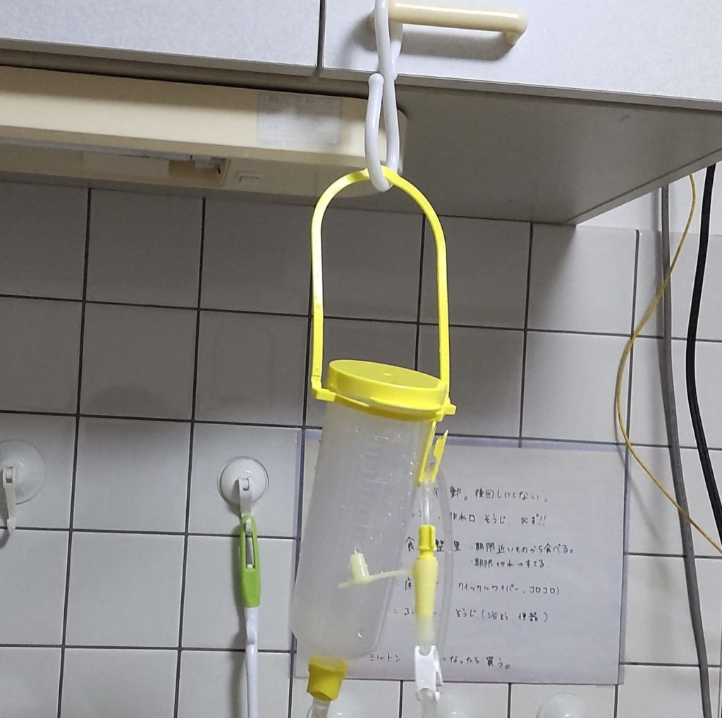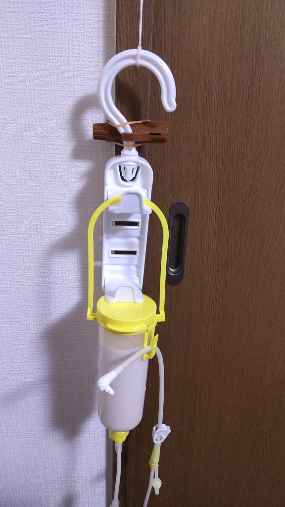 朝一と寝る前以外(起きている時)は、ハンガーラックにイルリガートルをかけて注入してます。
