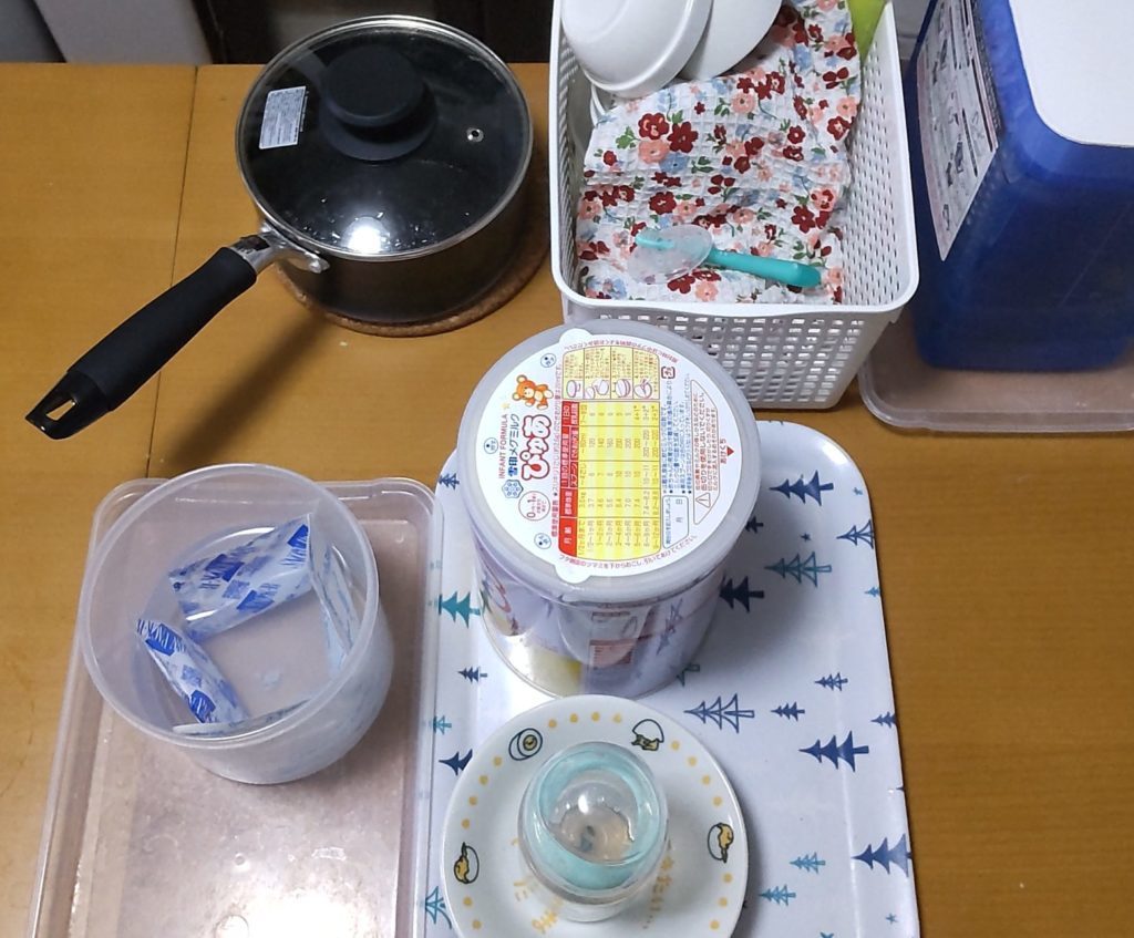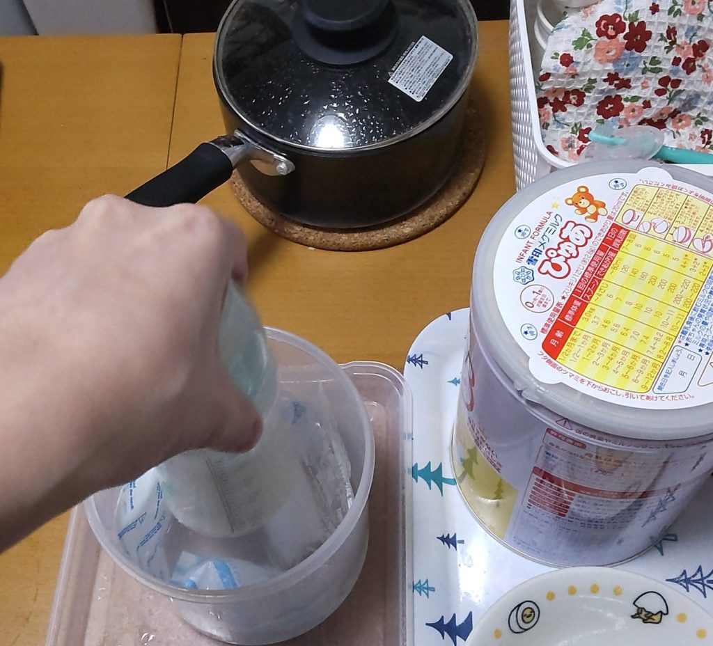 お湯を沸かしている間に粉ミルク、保冷剤、イルリガートル、エネーボの準備をします。