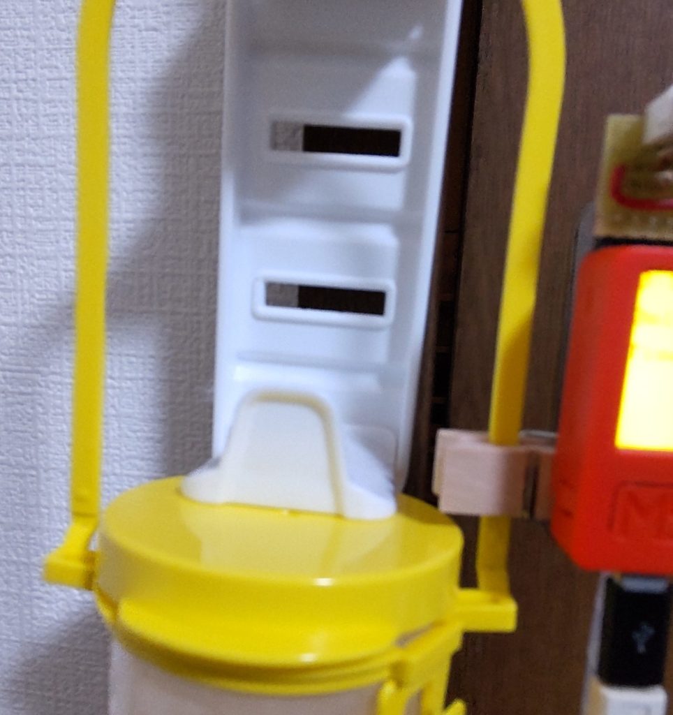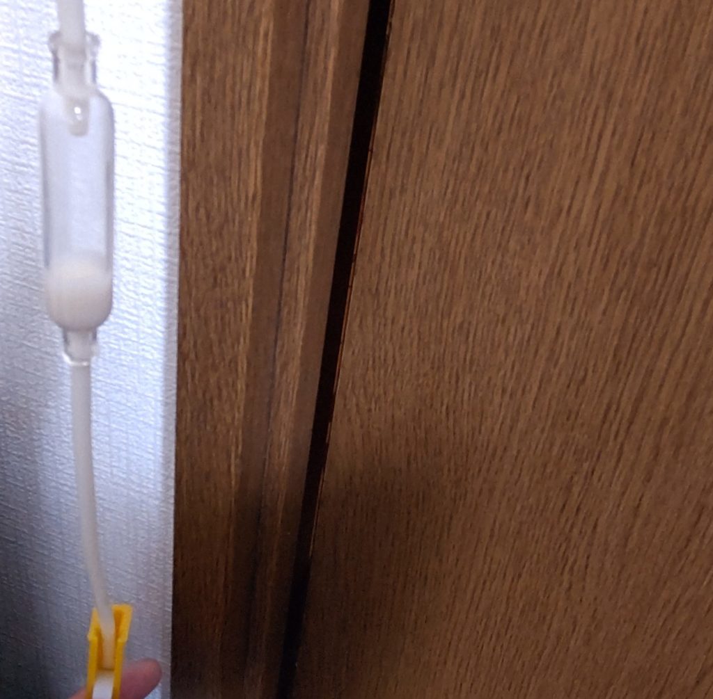 朝起きた時と寝るときは、100均のバックハンガーを糸を付けたフックに吊り下げて、寝室(扉の向こう側)にチューブを伸ばしています。