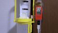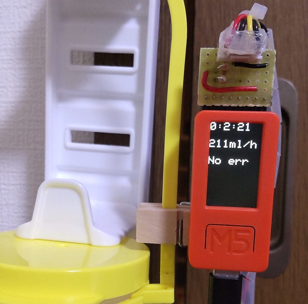 より正確な流量を測定するため、自作の点滴停止の検知装置を(下の写真左上)イルリガートルに固定して、センサのついたクリップを(下の写真右上)取り付けます。