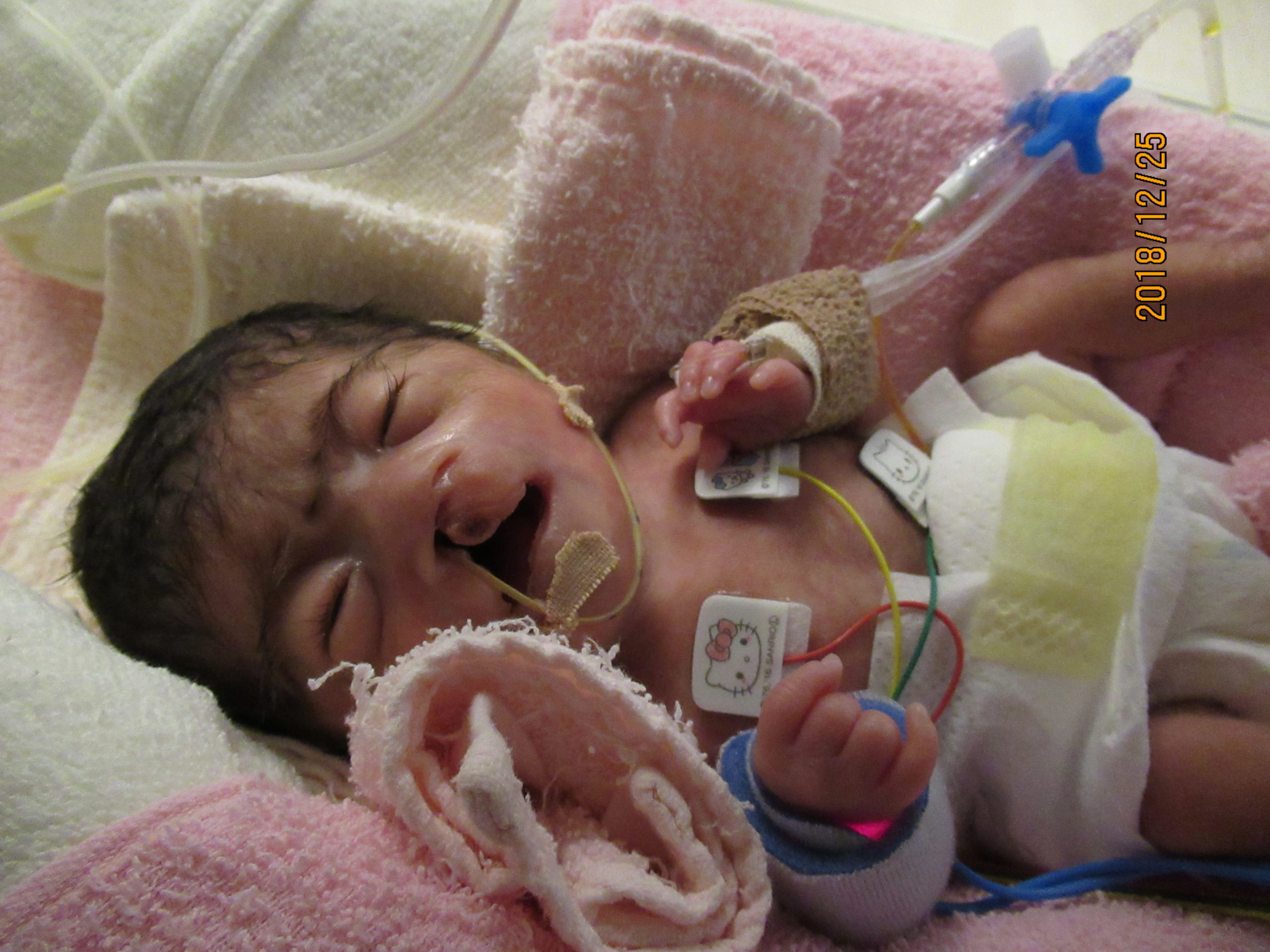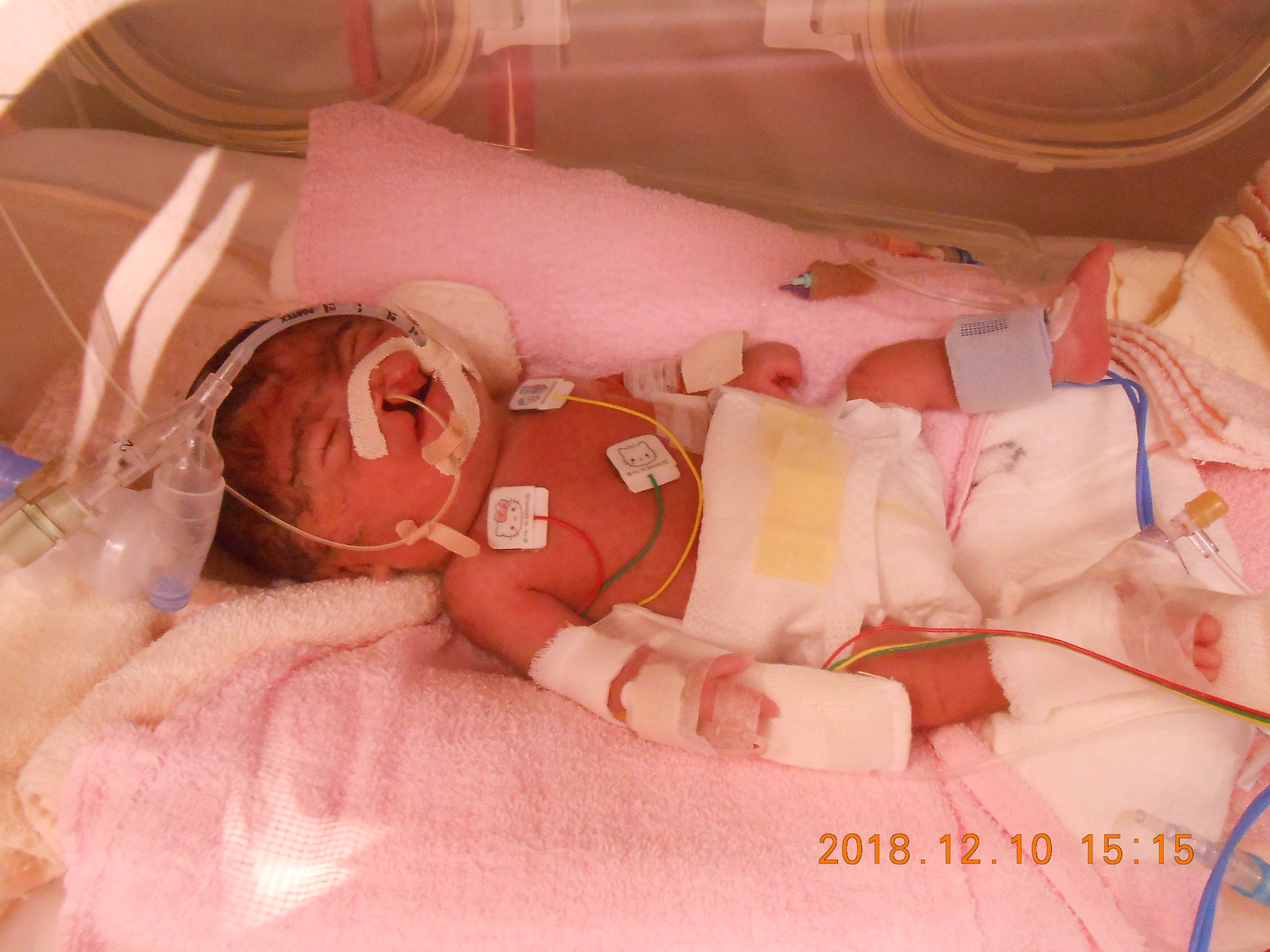最初は自発呼吸が上手くできず、人工呼吸器をつけていました。